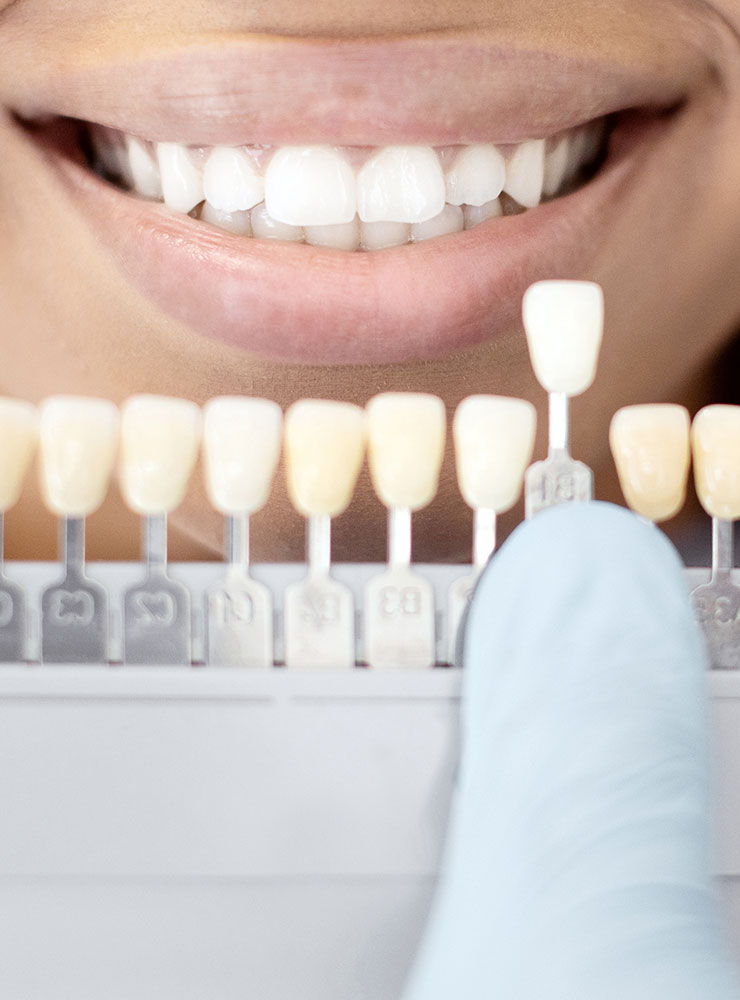 Veneers are small pieces of shaped porcelain used by dentists to restore the natural look of teeth. Veneers also protect the tooth’s surface from damage. We often use the same porcelain material used for making crowns and bridges. Veneers are used as well to change tooth shape, size, and/or color. Porcelain veneers are one of the most anesthetic methods of creating a more beautiful and pleasant smile.